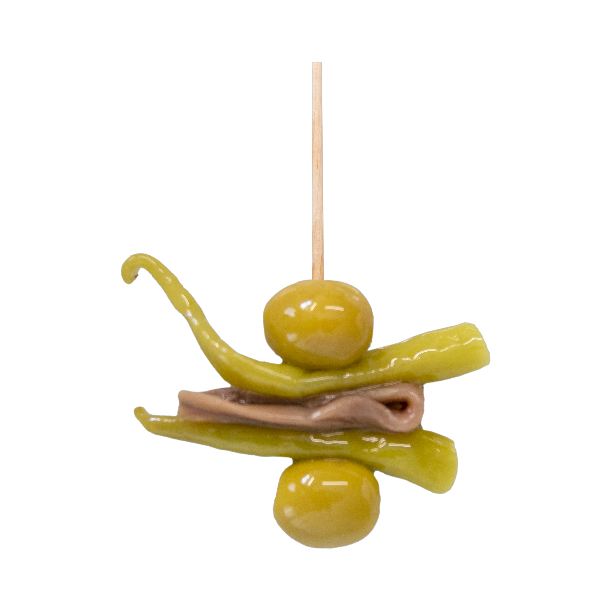 Cada unidad incorpora dos aceitunas verdes seleccionadas, dos piparras y una anchoa de calidad, ensartadas manualmente en palillo de madera para garantizar proporción constante y una presentación uniforme en cada servicio.