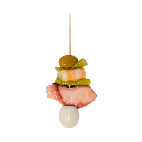 Cada unidad reúne aceituna verde, guindilla, pulpo cocido, langostino y huevo de codorniz, dispuestos de forma armónica para potenciar tanto la presentación como la intensidad de sabor. El resultado es una banderilla elegante, pensada para destacar en vitrinas y mesas de aperitivo profesional.